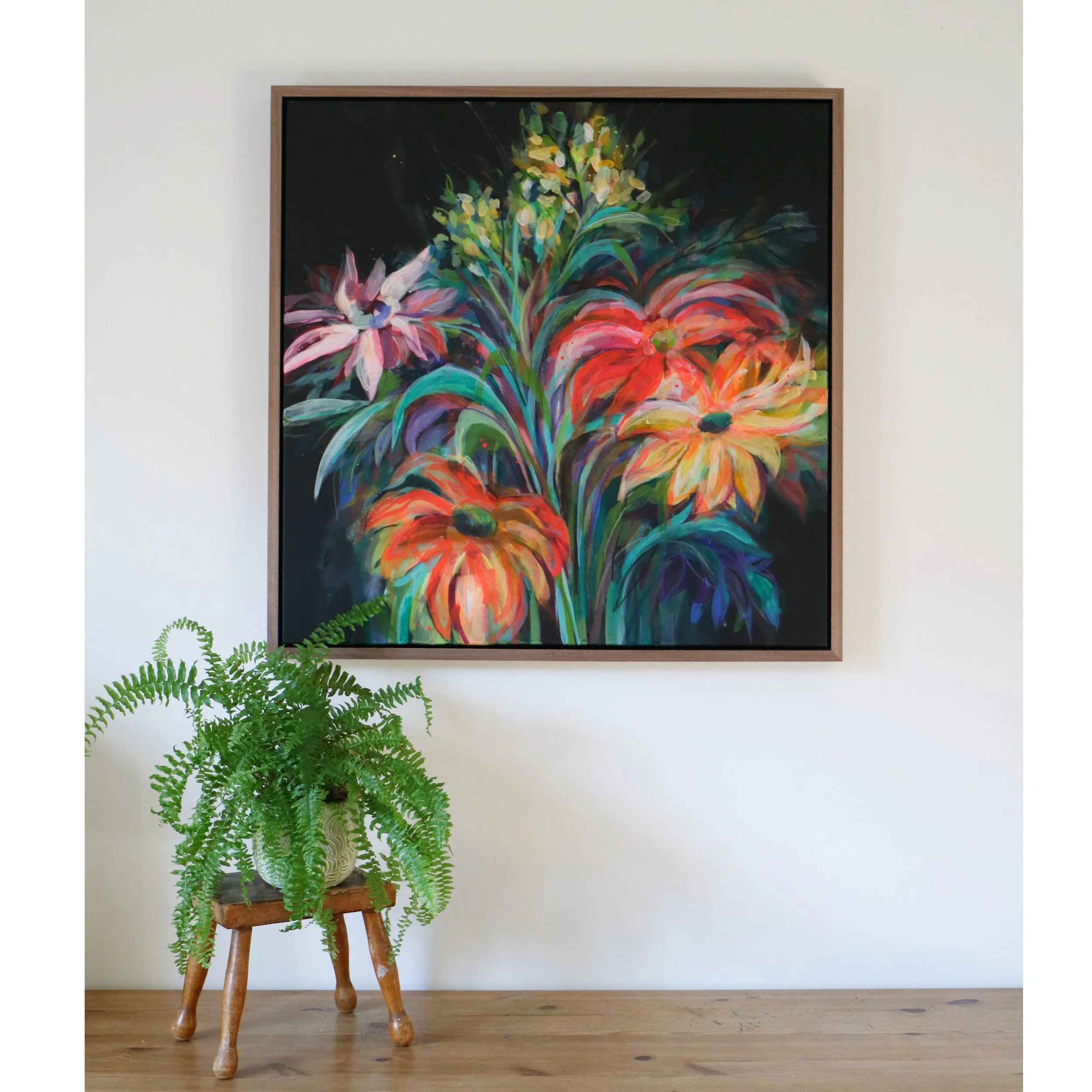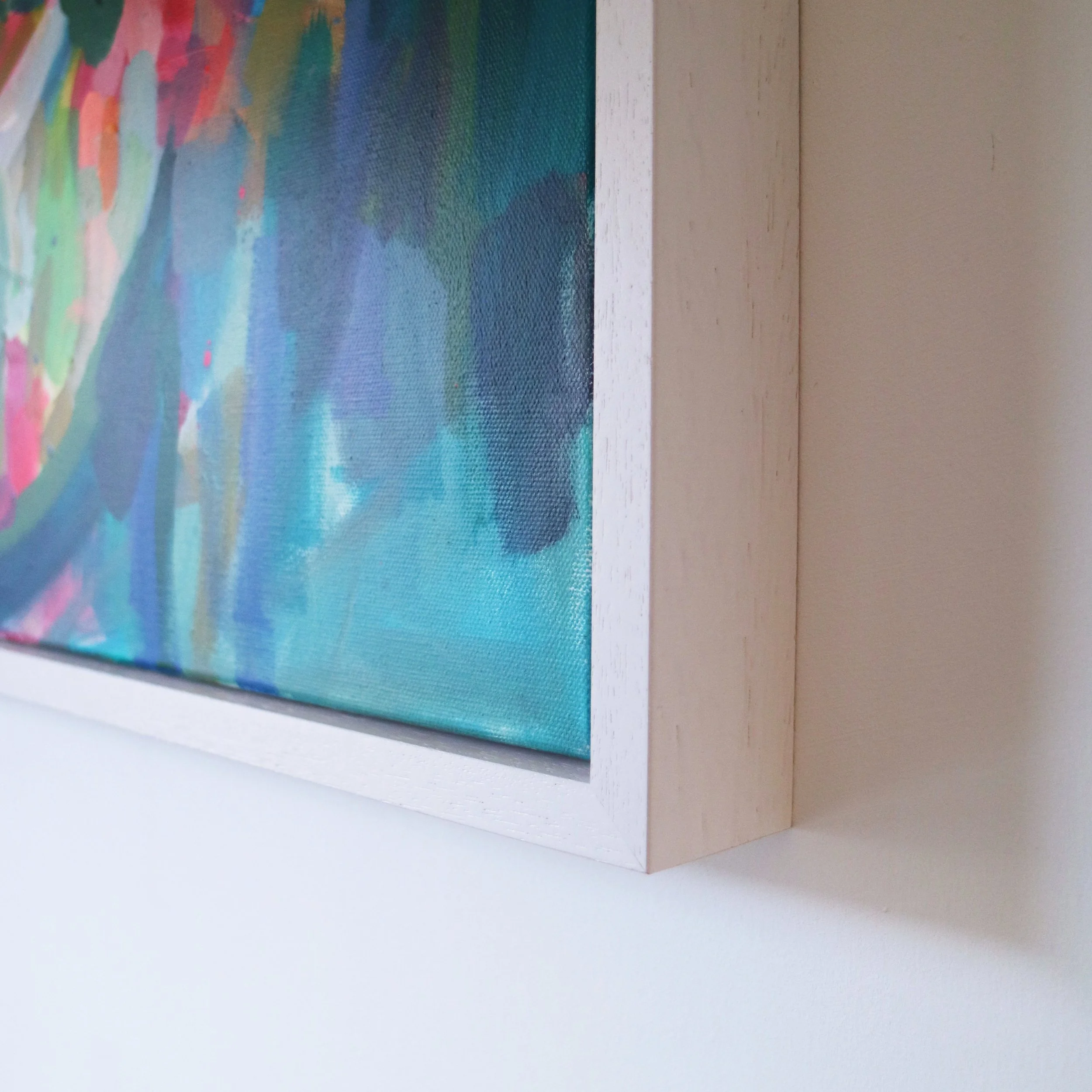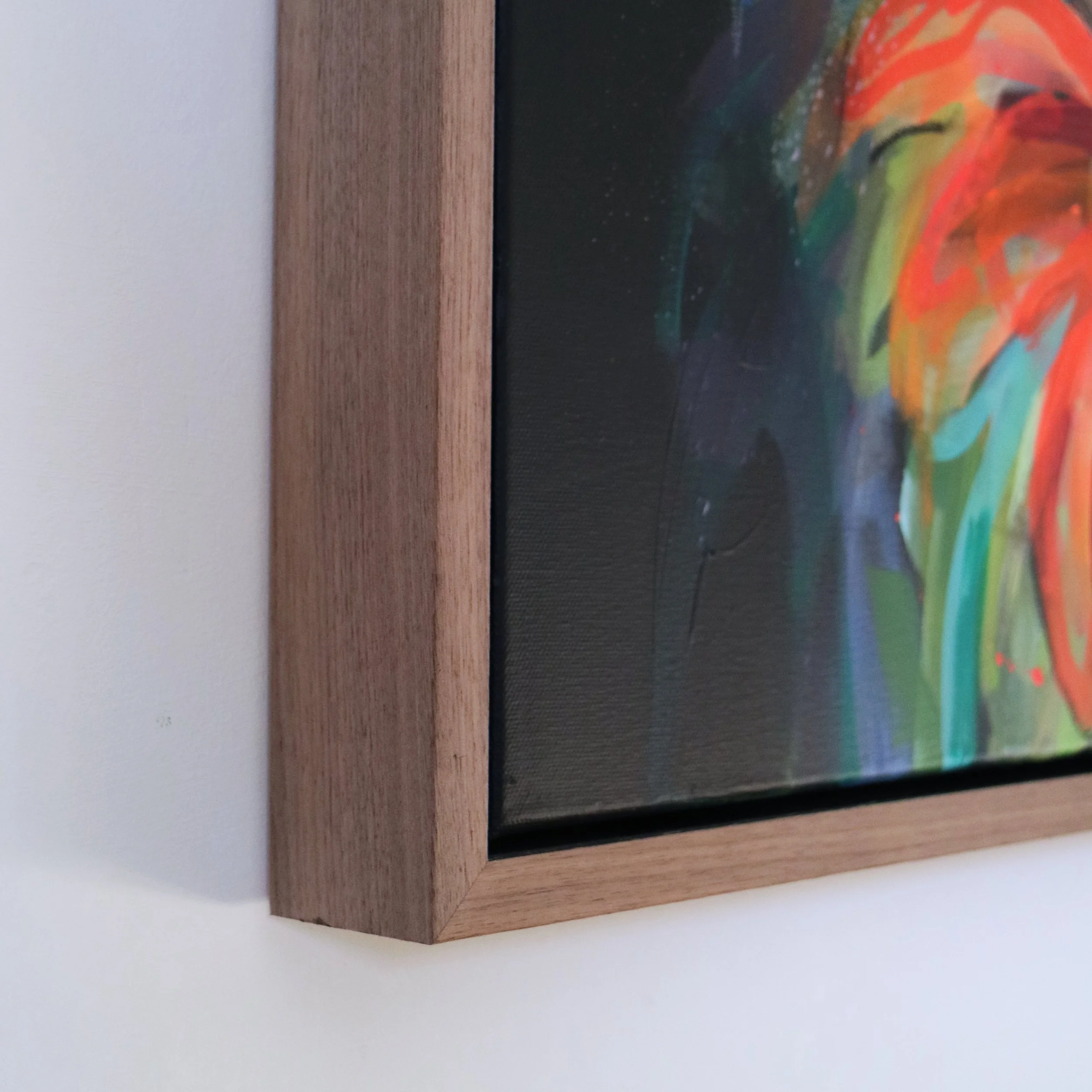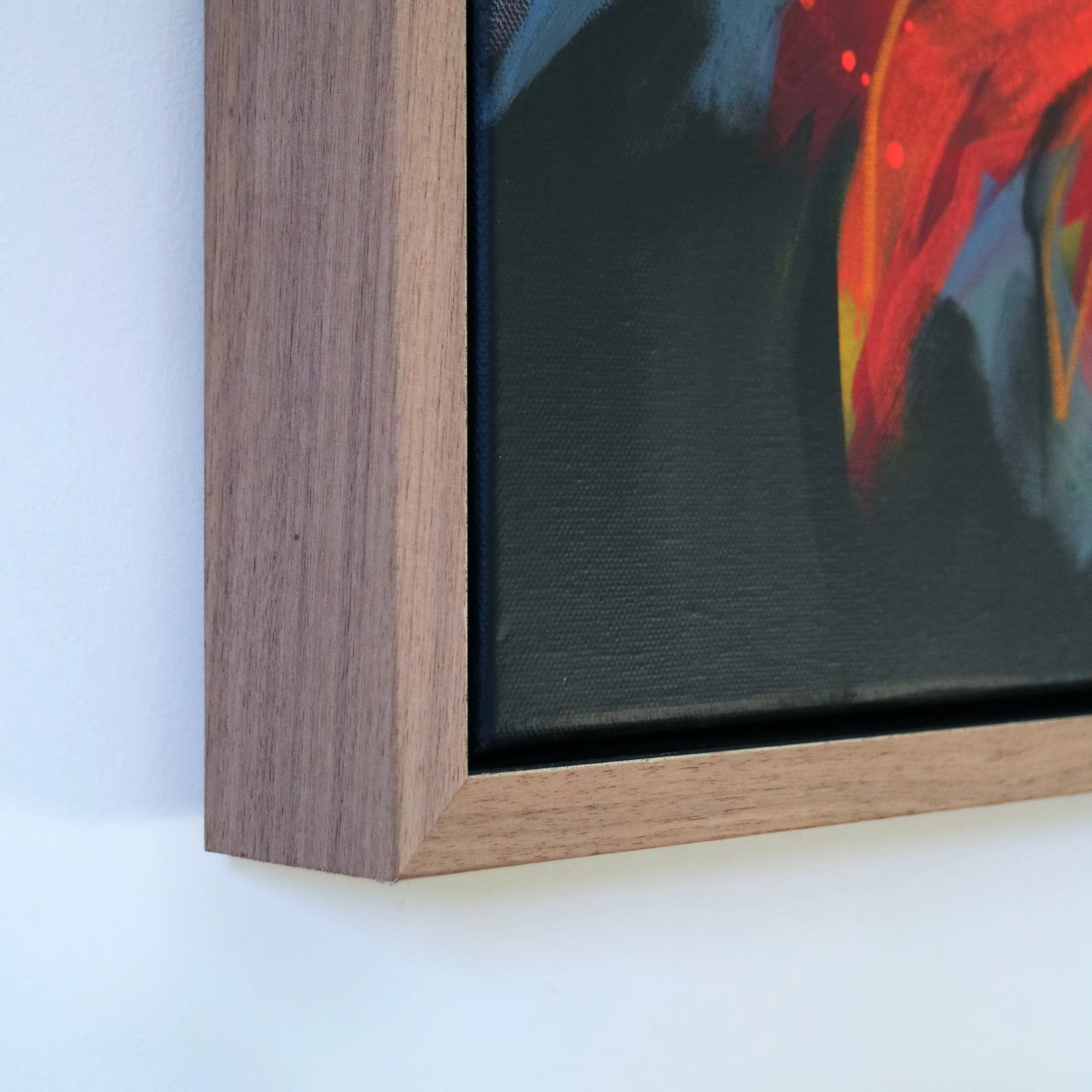 Framed in contemporary float frame with a walnut veneer, ready to hang.